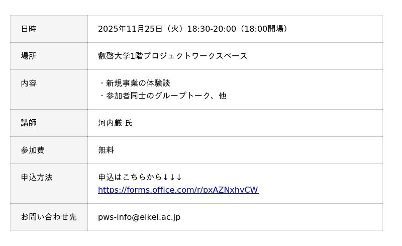 叡啓大学(学長:有信睦弘、広島市中区)は、2025年11月25日(火)、叡啓大学のプロジェクトワークスペースにて、PWS月次イベント「After Hours Innovation Talk ~元シャープのマーケターと語る、新規事業のリアル~」を開催します。講師は、シャープ株式会社で25年以上マーケティング、商品企画、ブランディングを担当し、「新プロジェクトX」でも紹介されたカメラ付きケータイやスマホ等100機種以上を市場へ送り出した河内厳さん。