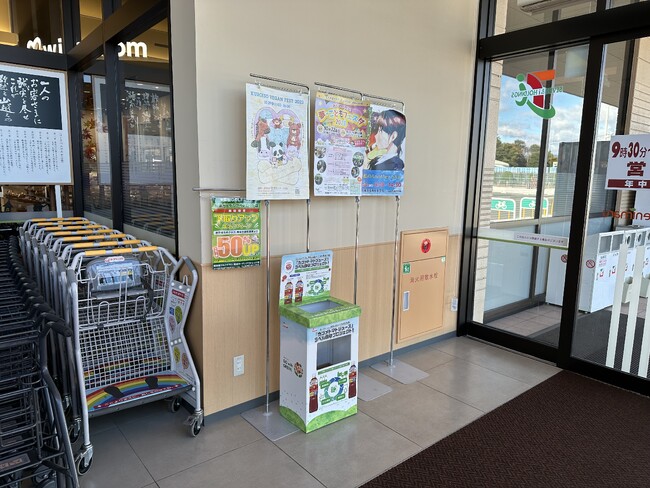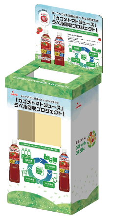 カゴメトマトジュースPETボトルの写真とリサイクルによる資源の循環をデザインした専用の回収ボックスを、店舗の入り口に設置