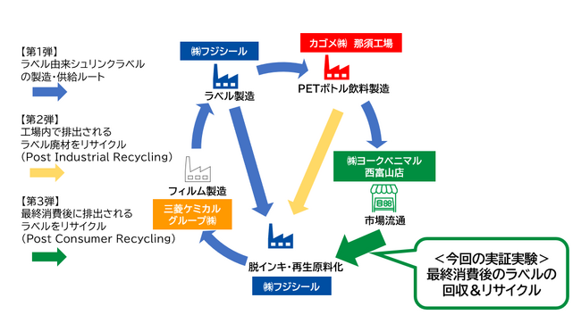 カゴメ株式会社(本社:愛知県名古屋市 代表取締役社長:山口 聡)は、株式会社フジシール(本社:東京都千代田区、代表取締役社長:柴田康裕)、三菱ケミカルグループ株式会社(本社:東京都千代田区、代表執行役社長:ジョンマーク・ギルソン)と協働し、当社が一部商品に採用している資源循環型(ラベルtoラベル)※ シュリンクラベルの市場回収による水平リサイクル実現に向け、実証実験を実施いたします。初回となる今回は、「カゴメトマトジュース 食塩無添加・低塩 各720mlPET」(発売90周年記念のロゴ入り パッケージ)を対象商品とし、株式会社ヨークベニマル 西富山店に回収のための専用ボックスを設置し、10月~12月の期間、回収を行います。