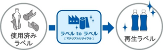 使用済みシュリンクラベルから印刷されたデザインを取り除き、新しいラベルに再生する技術です。消費者に有用な情報を伝えるラベルが再びラベルに生まれ変わる(マテリアルリサイクル)ことで、資源循環と温室効果ガス削減に寄与します。