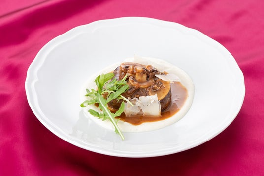 華やかなクリスマスイベントを演出するにふさわしい、このディナーコースのメインディッシュである「ハンガーステーキポルチーニクリーム カリフラワーピュレとパルメザンチーズ」は、コース提供に先駆け、12月15日(月)よりアラカルトメニューとして単品販売します。