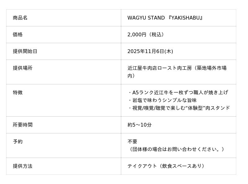 近江屋牛肉店ロースト肉工房を手掛ける近江屋牛肉店(本社:東京都中央区築地、代表:寺出昌弘)は、11月6日「WAGYU STAND」をオープンし、新メニューとして『YAKISHABU』(焼きしゃぶ)の販売を開始しました。
