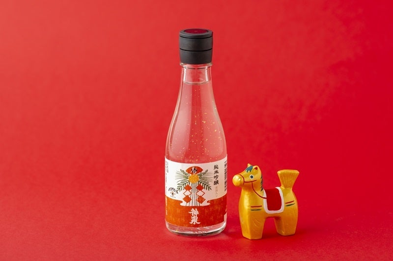 石川県東酒造の金箔入り純米吟醸酒。瓶をよく振って酒器に注げば、金箔がチラチラと舞う華やかさを愉しめます。アコメヤ限定の正月飾りデザインラベル。お正月の食卓や新年のご挨拶など、お祝いにおすすめのお酒です。