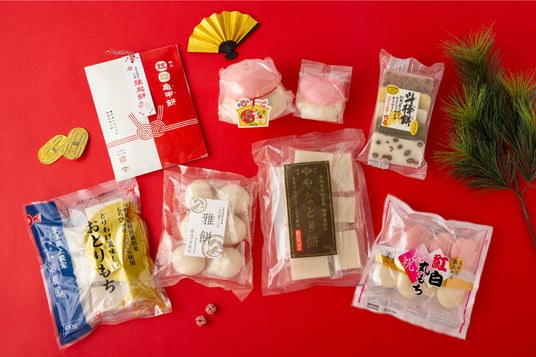 画像左下から)おとりもち 400g 850円/雅餅 6個入り 1,700円/やなどり餅 400g 1,800円/紅白丸もち 8個入り 890円