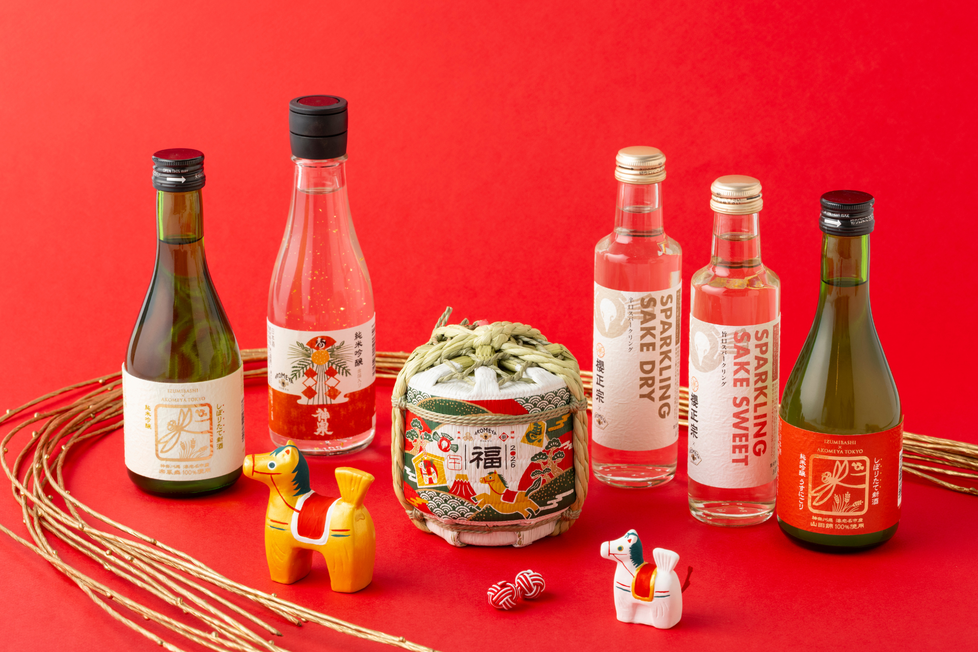 画像左から) 神奈川県 泉橋酒造 純米吟醸 うすにごり 300ml 1,600円/石川県 東酒造 純米吟醸 神泉 金箔酒 300ml 1,700円/兵庫県 櫻正宗 淡麗辛口 豆樽 2026(午)300ml 3,000円/兵庫県 櫻正宗 辛口スパークリング・旨口スパークリング 各200ml 各640円/神奈川県 泉橋酒造 純米吟醸 楽風舞 300ml 1,600円