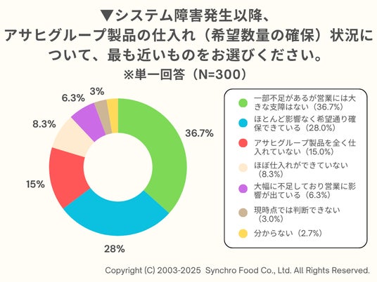 続いて、システム障害発生以降の、アサヒグループ製品の仕入れ状況について聞いたところ、「ほとんど影響なく希望通り確保できている」は28.0%にとどまりました。「一部不足があるが営業には大きな支障はない」(36.7%)、「大幅に不足しており営業に影響が出ている」(6.3%)、「ほぼ仕入れができていない」(8.3%)を合計すると51.3%となり、回答者の半数以上が何らかの仕入れ不足に直面していることがわかります。