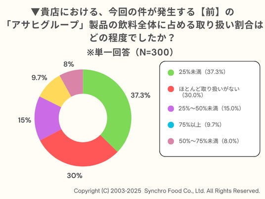 また、今回の事件が発生する【前】の「アサヒグループ」製品について、自店で取り扱う飲料全体に占める割合を聞いたところ、最多は「25%未満」(37.3%)、次いで「ほとんど取り扱いがない」(30.0%)という結果に。