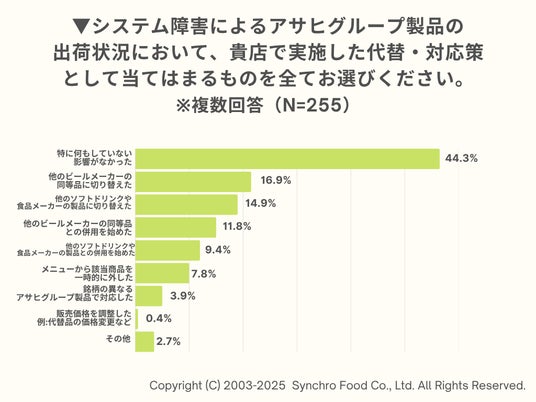 次に、「アサヒグループ製品を全く仕入れていない」と回答した45名を除く255名に対し、実施した代替・対応策を聞きました。