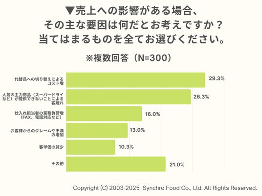 一方で、売上への影響要因について聞いたところ、「代替品への切り替えによるコスト増」(29.3%)が最多に。次いで「人気の主力商品(スーパードライなど)が提供できないことによる客離れ」(26.3%)と続きます。