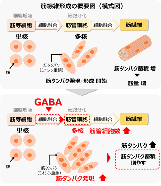 細胞は、通常、一つの細胞に一つの核をもっていますが、骨格筋細胞、即ち、筋線維は、その細胞同士が融合し、一つ以上の核をもつユニークな細胞で、筋タンパクはその細胞内を横断するように含まれます(図1上)。そのため筋量をあげる一つの方法としては、そのような多核の筋管細胞を増やし、その細胞内に含まれる筋タンパク質を増加させることがあげられます。本研究では、まず、GABAに骨格筋細胞の細胞融合を亢進する作用があるのかという点を、そのメカニズム解析に用いられるC2C12 細胞を用いて検討しました。