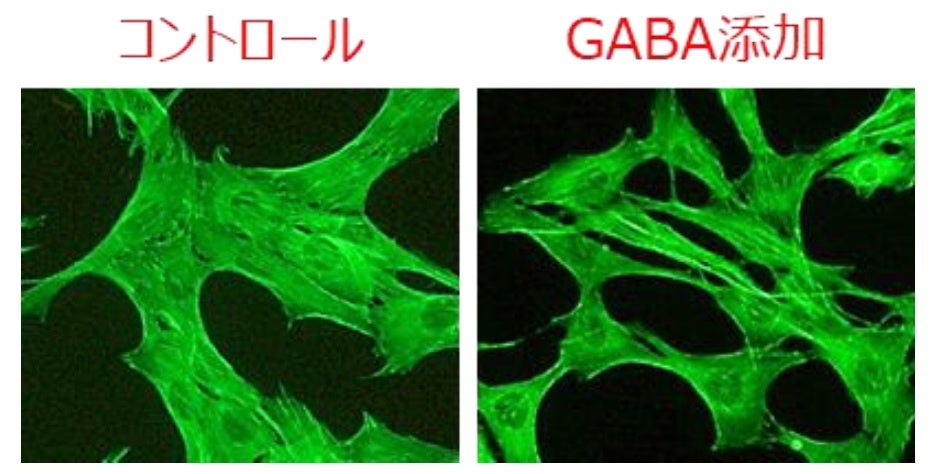 細胞は、その形を維持したり(細胞形態)、移動したり、増殖したりする際、細胞骨格とよばれる細胞内に張り巡らされたタンパク質繊維のネットワーク構造を変化させます。骨格筋細胞に起こる細胞融合にも細胞骨格は関わり、中でも細胞骨格タンパク質であるアクチンフィラメント(F-アクチン)は、細胞融合時、その構造を変化させ、特徴的な形状を示します。この変化を指標に、GABAの活性を検討しました。