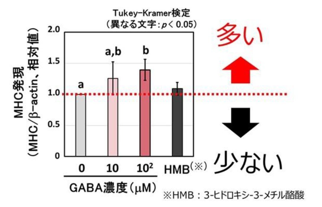 以上の結果から、GABAは骨格筋細胞の細胞融合を亢進し、筋タンパクの発現誘導する活性をもつことが示されました(図1下)。