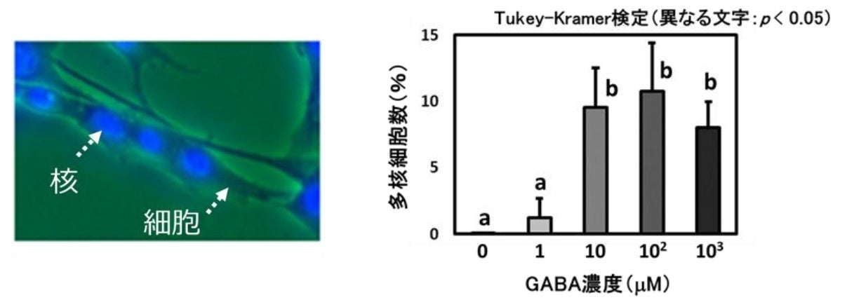 ? GABA存在下でC2C12筋芽細胞を培養したところ、多核の筋管細胞数が有意に増加したことから、GABAには骨格筋細胞の細胞融合を促し、多核である筋管細胞数を増加する活性があることを見出しました。