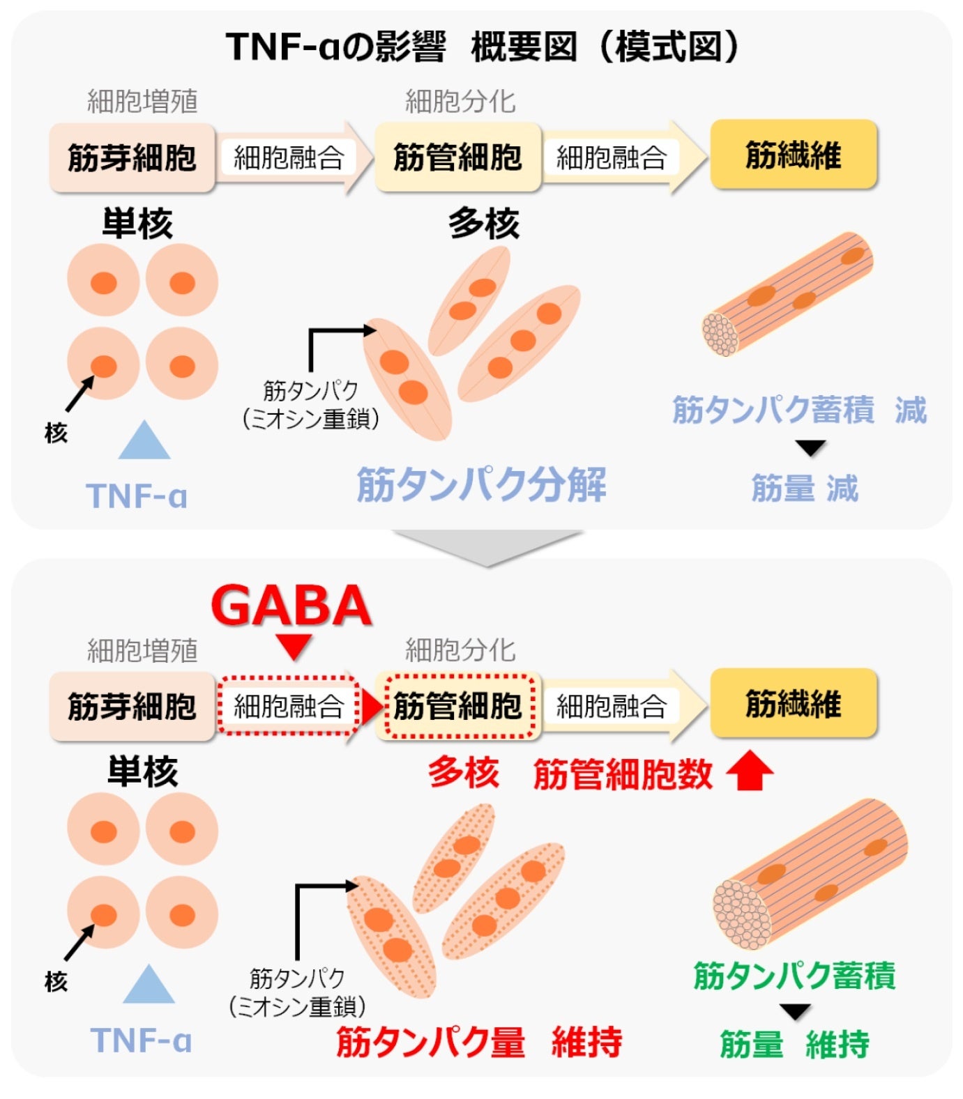 図5 TNF-αによる筋タンパク低下作用とGABA添加時の作用を示す模式図