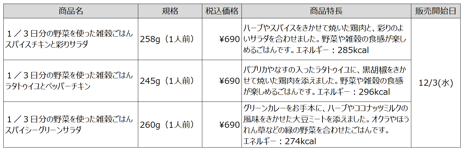 今回発売する「1/3日分の野菜を使った雑穀ごはん」は、不足しがちな野菜を手軽に摂取できるように考えた、温めるだけで食べられる1食分のプレートごはんで、「スパイスチキンと彩りサラダ」、「ラタトゥイユとペッパーチキン」、「スパイシーグリーンサラダ」の3種を発売します。
