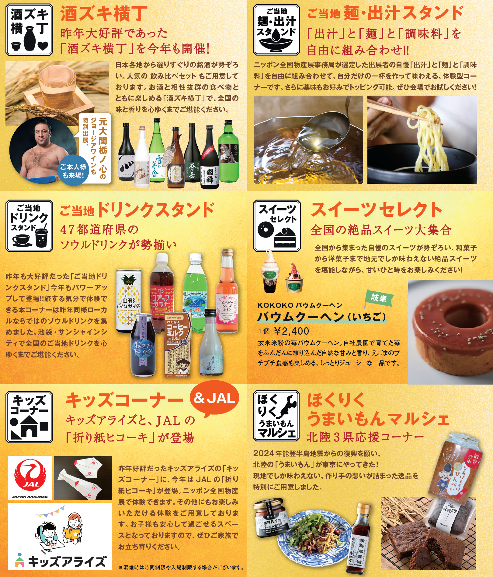 全国津々浦々から地域自慢の郷土料理や特産品などの“食”や“物”が池袋の地へ一堂に集結します。定番ご当地商品や知られざる名産品まで、多彩なラインナップを展開。「ご当地フードコート」「ご当地物販コーナー」「スイーツセレクト」「酒ズキ横丁」「ご当地ドリンクスタンド」「キッズコーナー」に加え、新企画の「ご当地麺・出汁スタンド」や、北陸を応援する「ほくりくうまいもんマルシェ」など、今年ならではの見どころも満載です。
