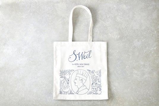 ホテル直営ショップ「S.Weil by HOTEL NEW GRAND」のオリジナルトートバッグ。厚手のコットン100%素材とS.Weilのスタイリッシュなロゴがアクセント。毎日のお買い物使いに便利な大容量なバッグです。以前よりも厚みを増し16オンスにリニューアル、上質感がアップしました。