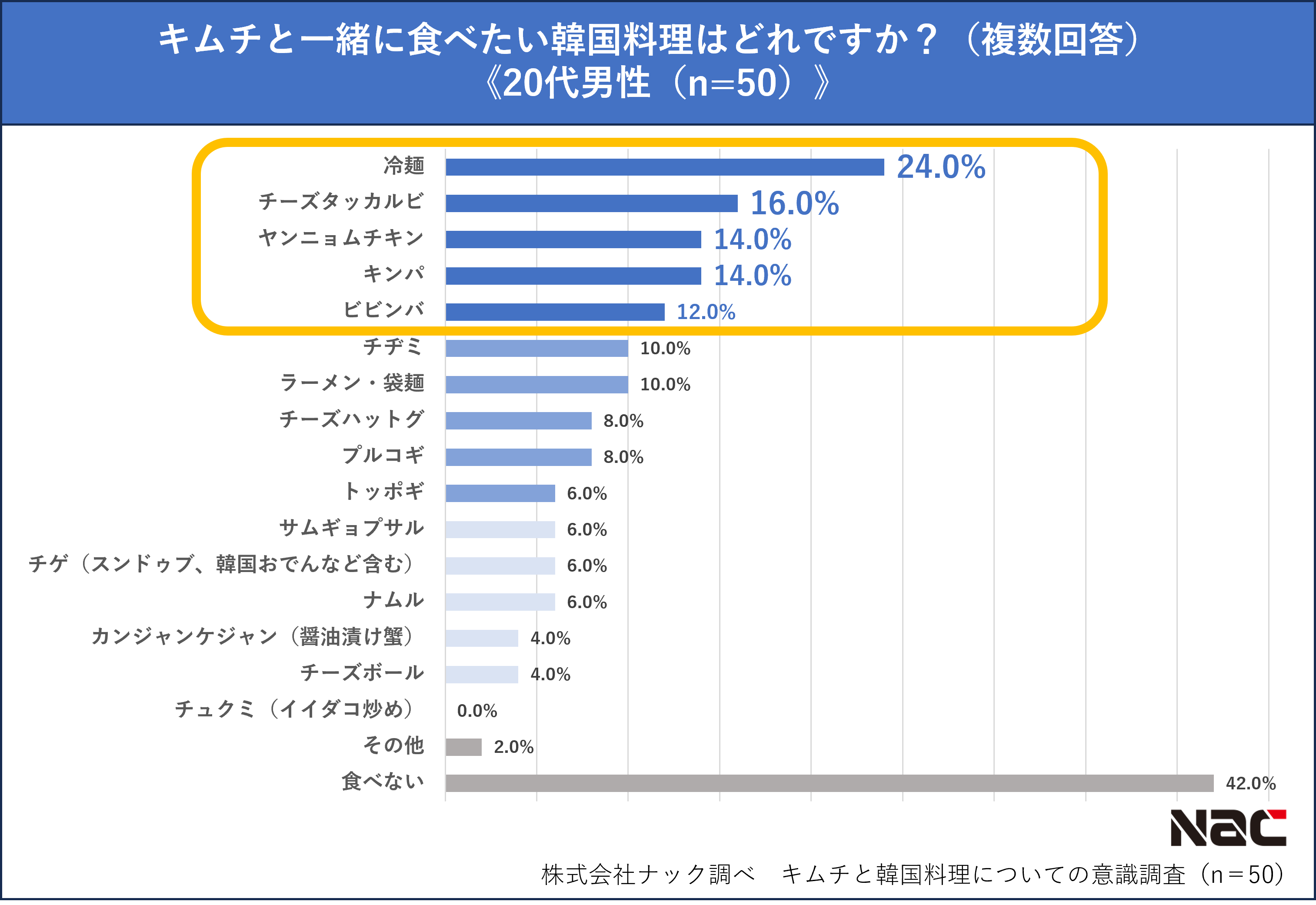 続いて、キムチと一緒に食べたい韓国料理をすべて選んでもらったところ、こちらも「ビビンバ」が35.6%を占めて全体1位となりました。世代別に見ると、30代以上は男女ともに全体の傾向と似ていたのに対し、20代女性は「キンパ」が34.0%で1位、20代男性は「冷麺」が24.0%で1位となり、前項と同様20代のみほかの世代と異なる傾向が見られました。