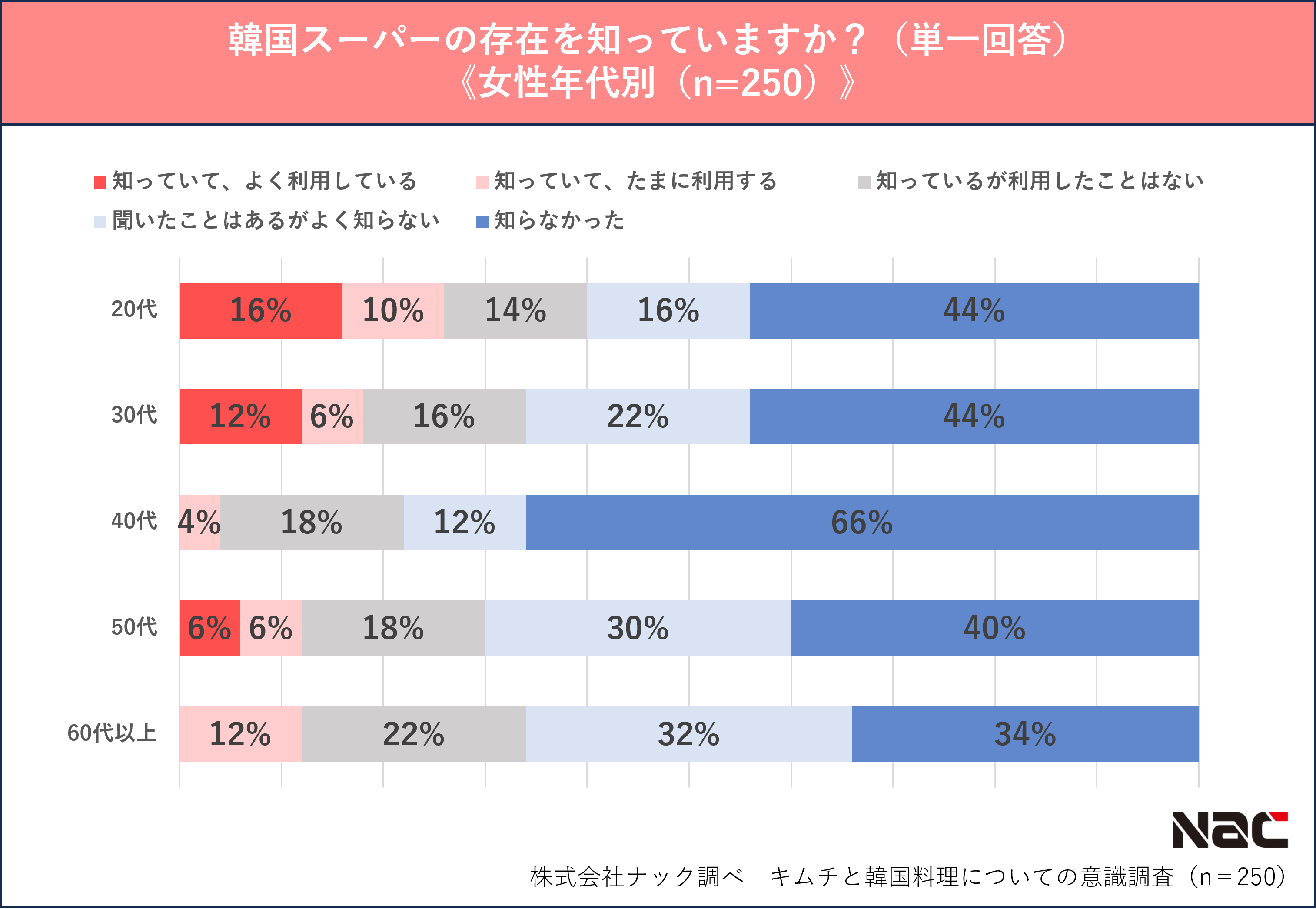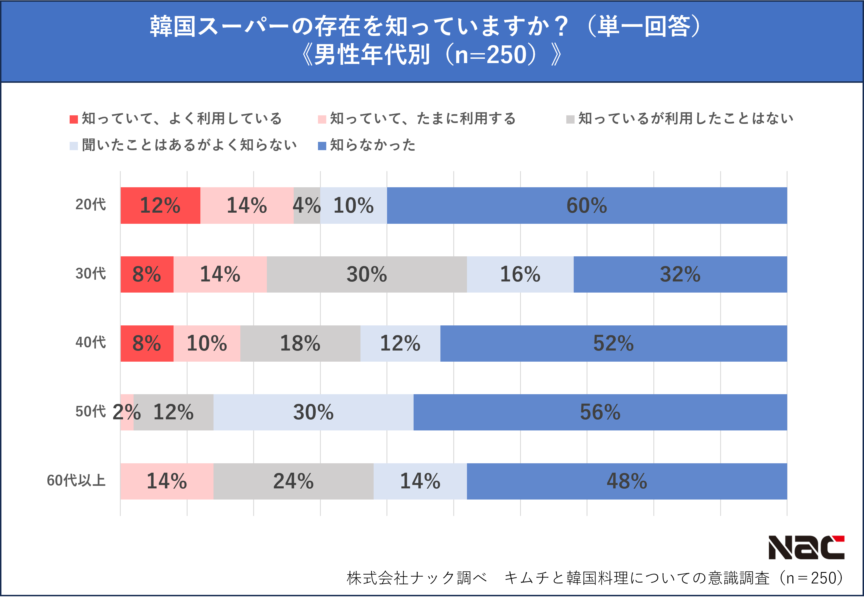 男女ともに「知っていて、よく利用している」のは20代が最多となり、若い世代が最もよく利用していることが分かりました。「知っていて、たまに利用する」も含めると利用経験はほとんどの世代で男性が多い一方、女性は男性に比べて、50~60代でも韓国スーパーを知っている人が多い結果となりました。