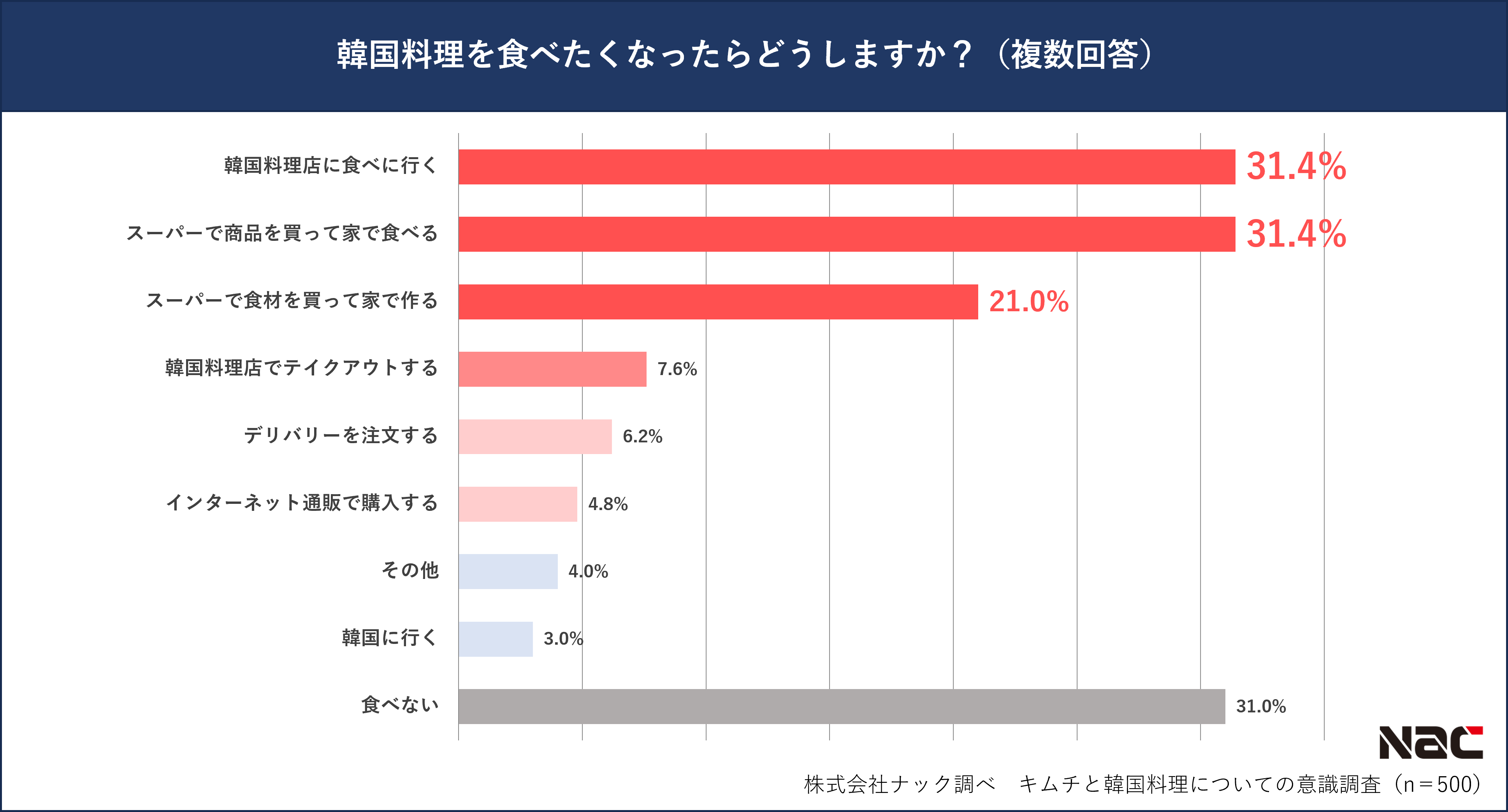 韓国料理を食べたくなったらどうするか聞いたところ、「韓国料理店に食べに行く」「スーパーで商品を買って家で食べる」が31.4%で同率1位となりました。また、「スーパーで食材を買って家で作る」が21.0%となり、自炊派も一定数いることが分かりました。