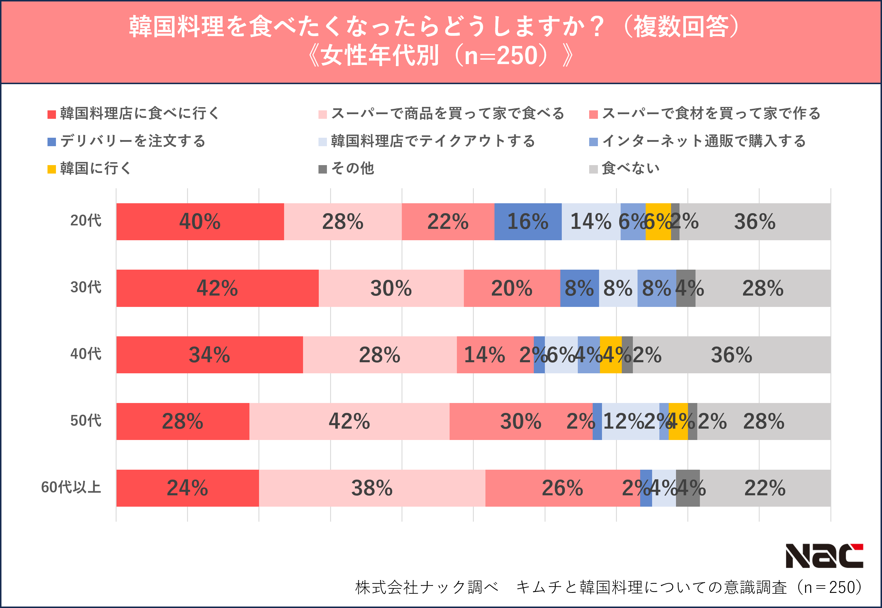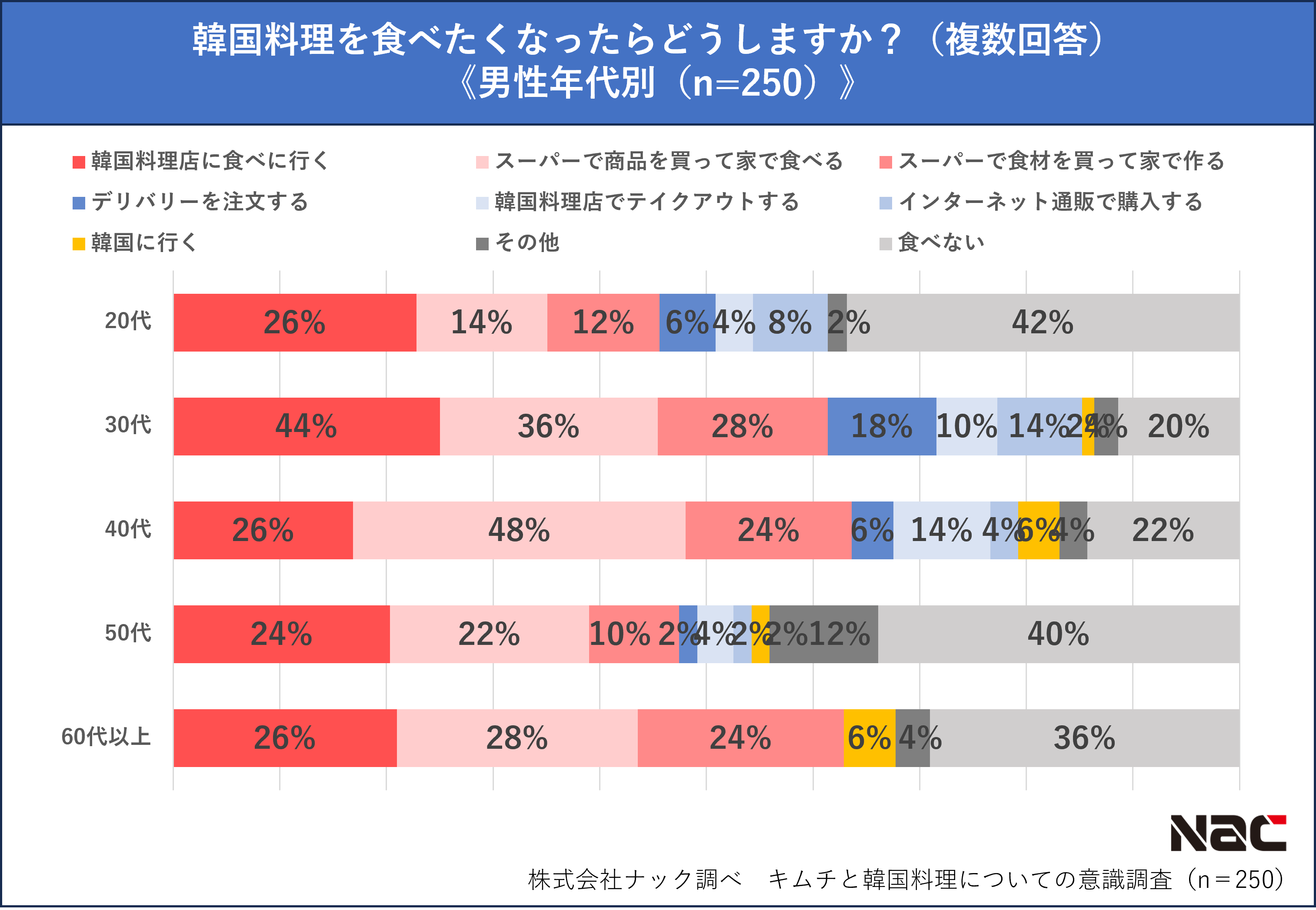 世代別に見ると、男女ともに「韓国料理店に食べに行く」人は20~30代が多い一方、40代以上の世代は「スーパーで商品を買って家で食べる」「スーパーで食材を買って家で作る」人が多いことが分かります。韓国料理を食べる際は若い世代ほど外食派が多く、40代以上の世代は家で食べる人が多いことが明らかになりました。