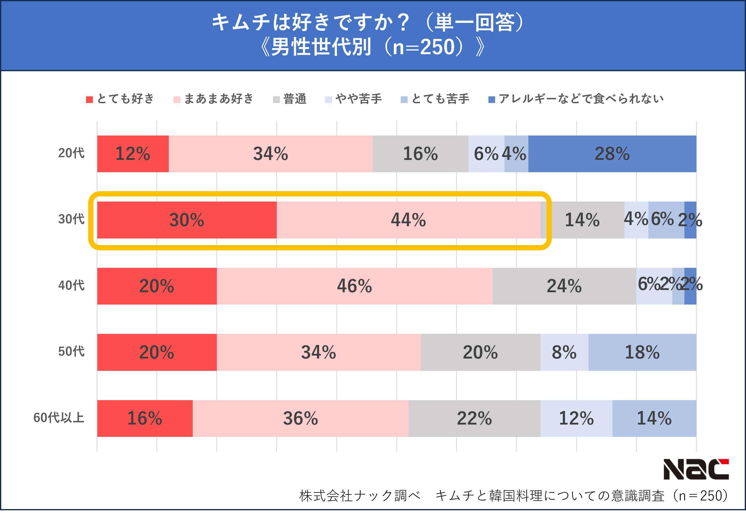 男女世代別で見ると、 「とても好き」「まあまあ好き」と答えた人は男女ともに30代が最も多く、男性30代で74.0%、女性30代で64.0%を占めました。また、男女ともに40代が2番目に多く、キムチは30~40代の世代に特に人気であることが分かります。