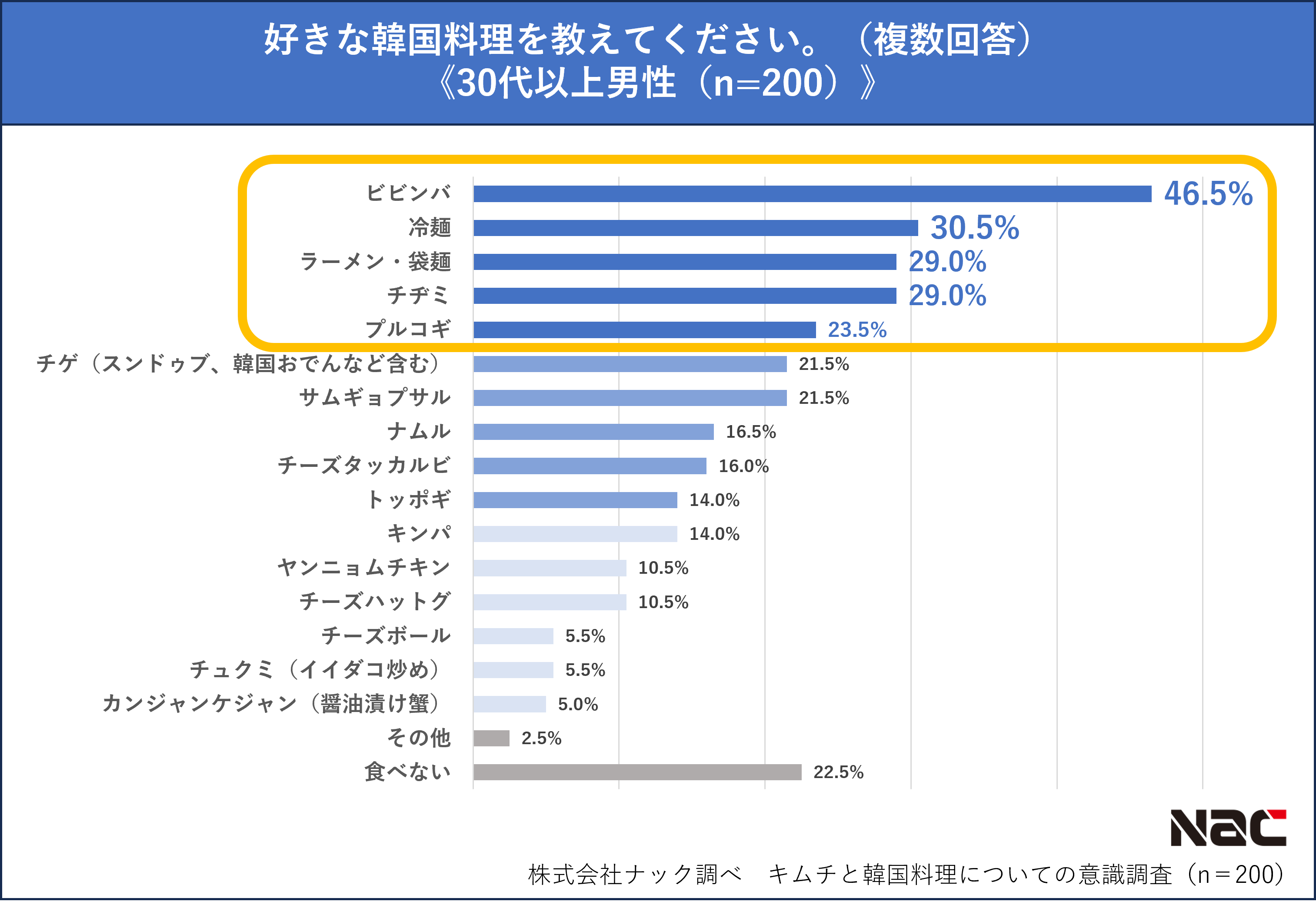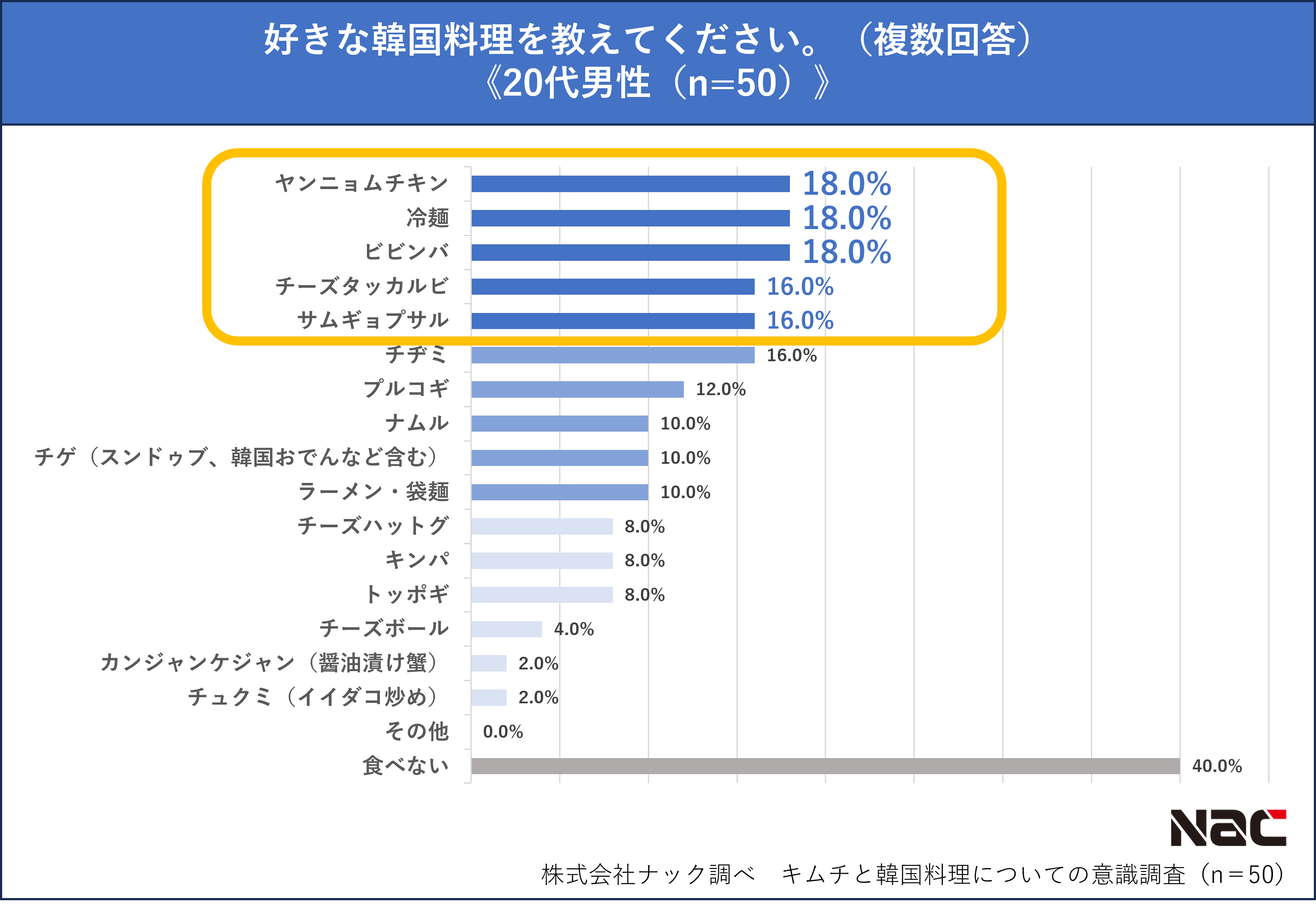 2.好きな韓国料理は「ビビンバ」が約4割を占めて全体1位。一方、20代は「ヤンニョムチキン」が1位となり、他の世代と異なる結果に