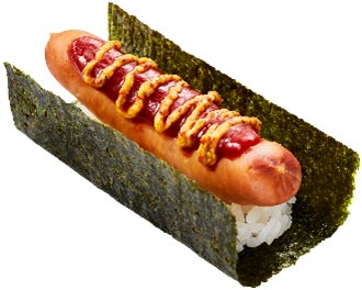 『ウインナーのすしドッグ~ケチャップ・マスタード~』230円(税込)ジューシーな相模豚を使用したウインナーを、ふんわりシャリと海苔で巻き上げました。肉の旨みと酢飯の爽やかさが絶妙にマッチします。