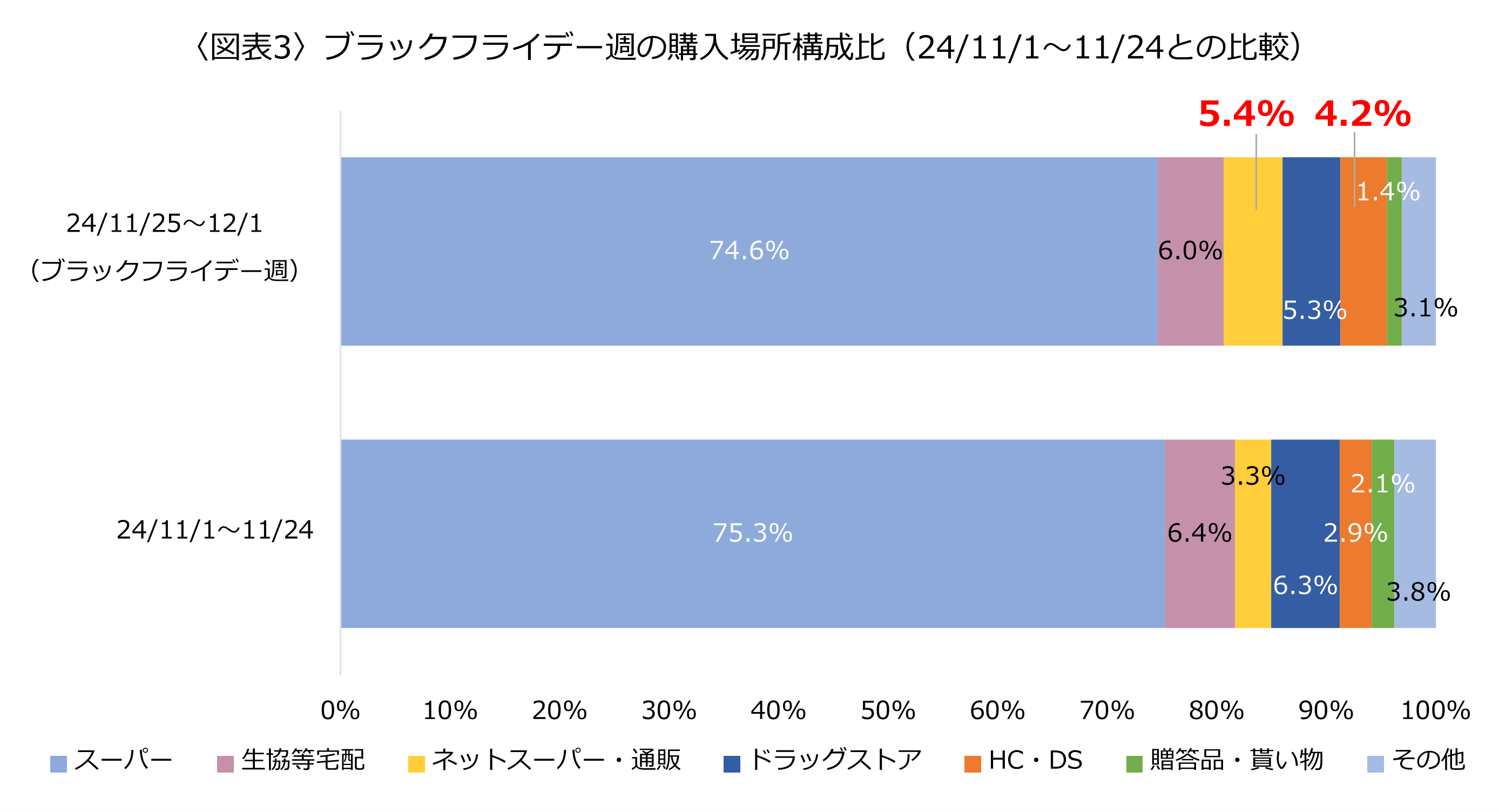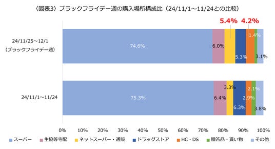 <図表3>は食MAPモニタのブラックフライデー週の購入場所を、24年11月のブラックフライデー週以外の期間と比較しています。