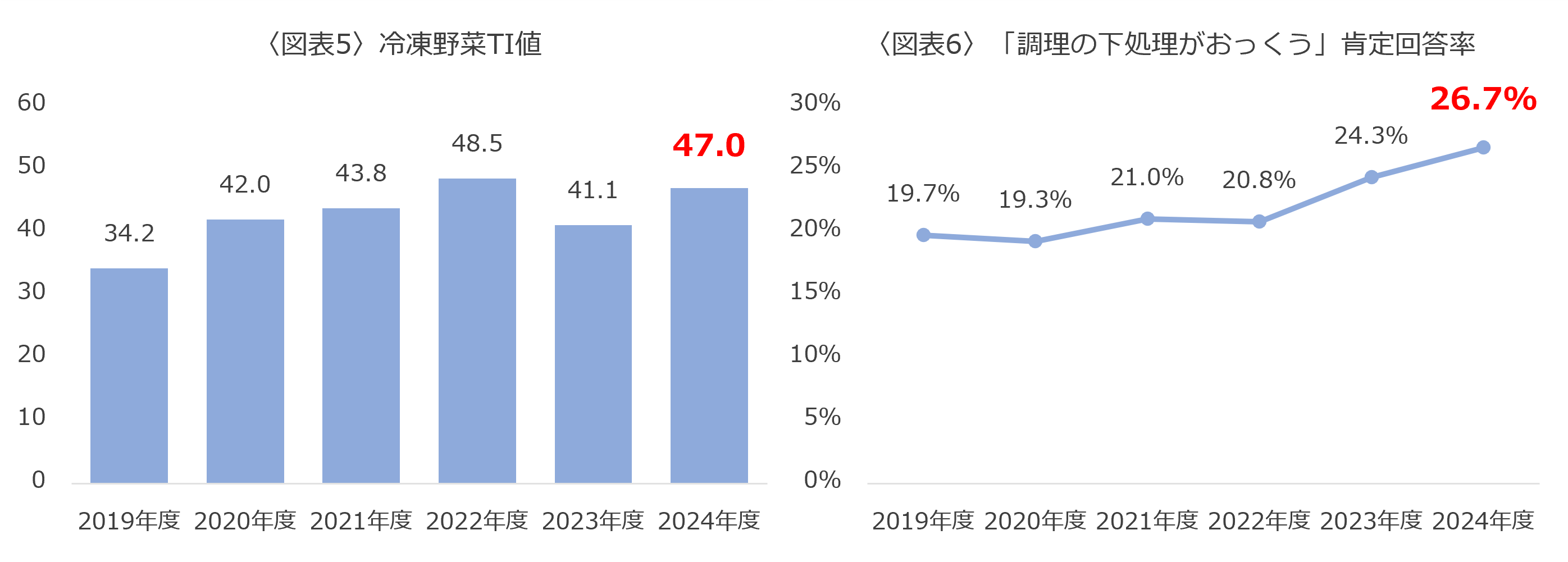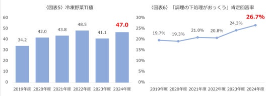 〈図表5〉分析期間:2019/4/1~2025/3/31 食卓機会:一日計 TI値:1000食卓あたりの出現回数 〈図表6〉分析期間:2019/4/1~2025/3/31 回答率:食MAPモニタに対して定期アンケートを実施しており「調理の下処理がおっくう」に対して『あてはまる』『まああてはまる』と回答したモニタの割合