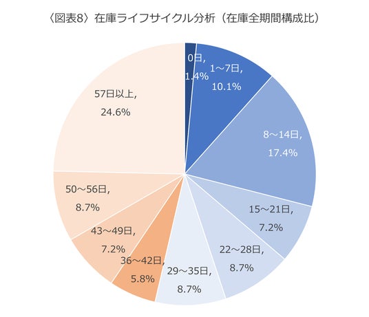 <図表8>は、ブラックフライデー週に購入された冷凍の野菜のうち、容量「500g-1kg未満」の商品が、購入から使い切りまでにどのくらいの期間を要するのかを表しています。データより、購入された冷凍野菜商品(500g-1kg未満)のうち、約半数はその後35日以内に使い切られています。つまり、ブラックフライデー週に購入されたこれらの商品の多くがクリスマス~年末頃にはすでに使い切られていると見ることができます。そのため、冷凍の野菜(大容量商品)はクリスマス前~年末(ブラックフライデーから2週間~1か月後)にかけて改めて訴求を行うと、ちょうど家庭に在庫がない世帯への継続的な購買タイミングになるかもしれません。