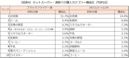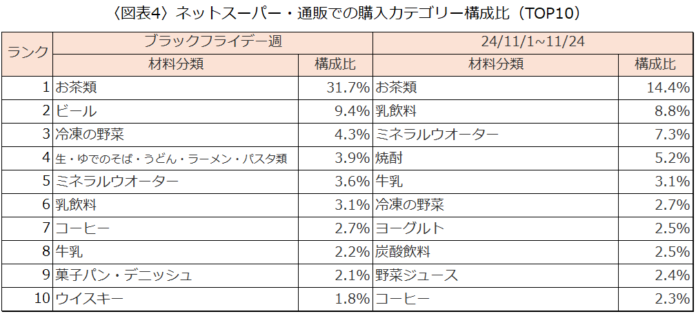 食品の購入はスーパーがメインですが、ブラックフライデー週では、「ネットスーパー・通販」の割合が5.4%と、24年11月のブラックフライデー週以外の期間より高くなる傾向があります。食品の購入の際にも、ブラックフライデーのセールは活用されているようです。ブラックフライデー週の「ネットスーパー・通販」ではどのような食品が購入されているのでしょうか。