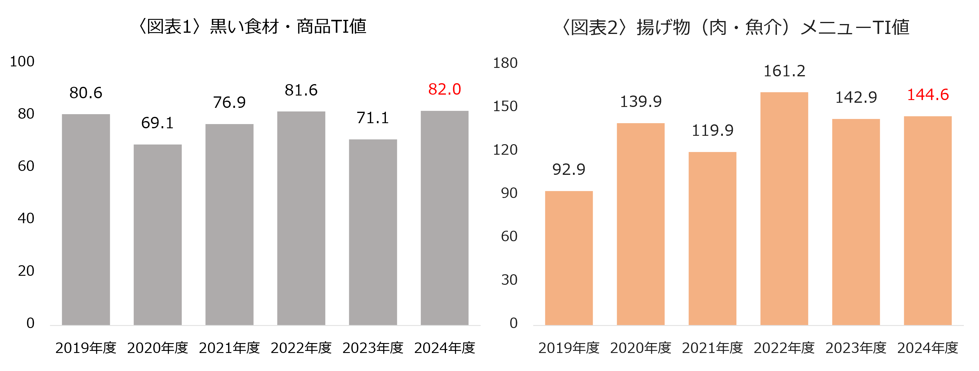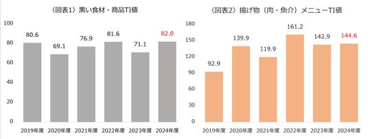 2019年度(コロナ禍前)から2024年度にかけて見ていくと黒い食材・商品TI値(1000食卓あたりの出現数)は横ばいに推移していますが、揚げ物メニューのTI値は、2019年度と比較すると約1.5倍増加しています。ブラックフライデーセールの消費者の認知度も高まっていることから、ブラックフライデーと関連させたメニューの提案も効果があるのかもしれません。