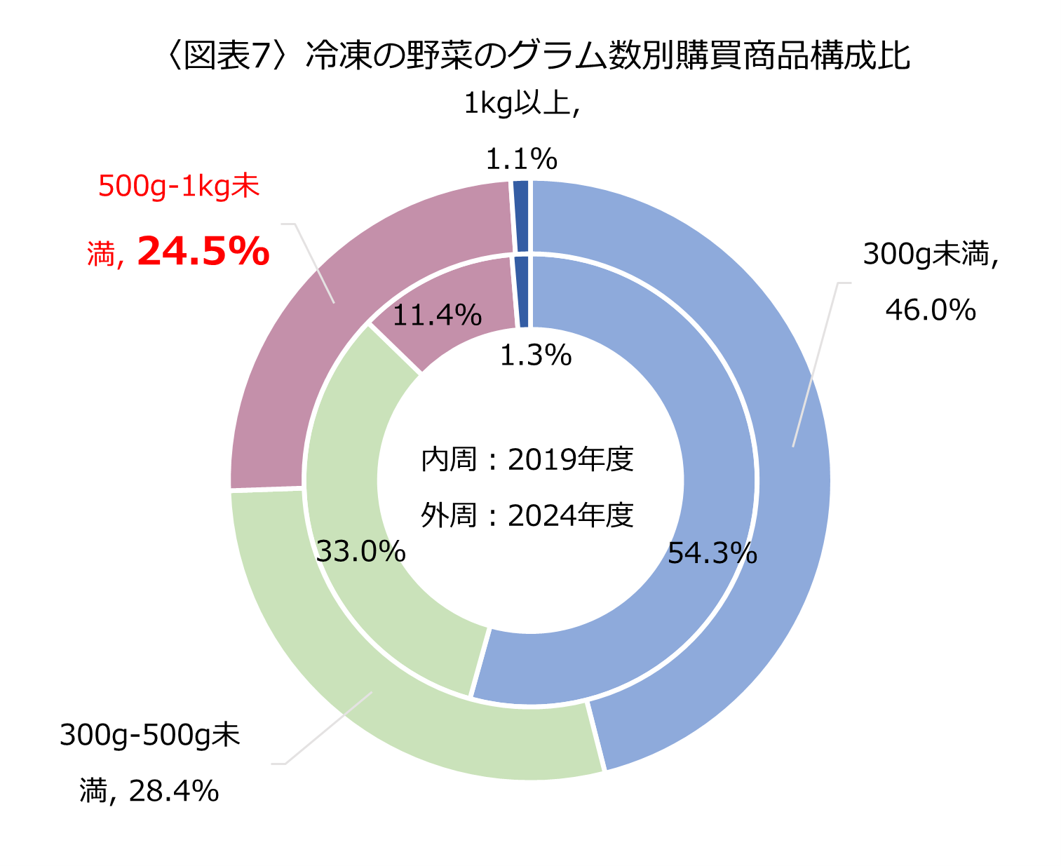 <図表7>は2019年度(コロナ直前)と2024年度で購入された冷凍の野菜商品をグラム数の構成比で表しています。2019年度から2024年度にかけて、500g-1kg未満の商品の構成比が11.4%から24.5%と2倍以上に増加していることが特徴的です。