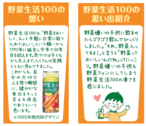 「野菜生活100」は、今年で発売30周年を迎えます。1995年の発売以来、野菜をもっとおいしく、もっと手軽に、毎日の暮らしの中で身近に感じていただきたい。そんな思いを大切にしながら皆さまと歩んできた、カゴメを代表するロングセラー商品です。