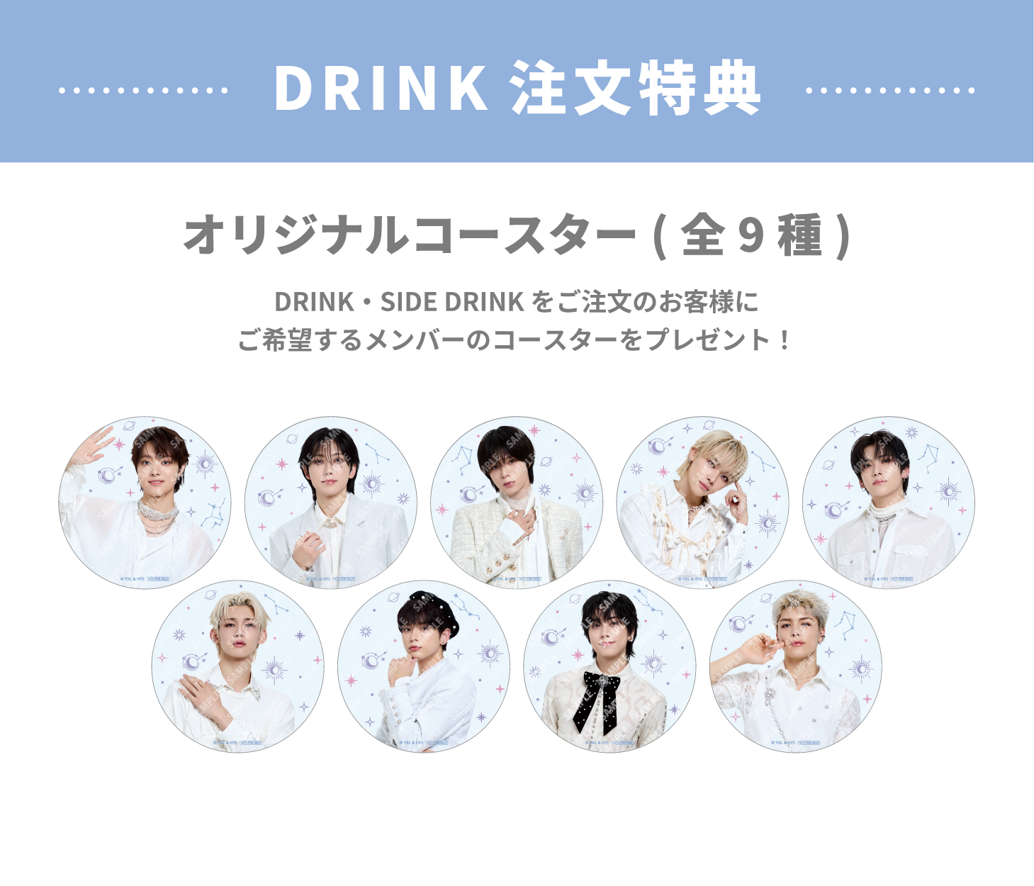 ■DRINK注文特典:CAFEでドリンクメニューをご注文された方にご希望するメンバーの「オリジナルコースター(全9種)」を1品につき1枚プレゼント。