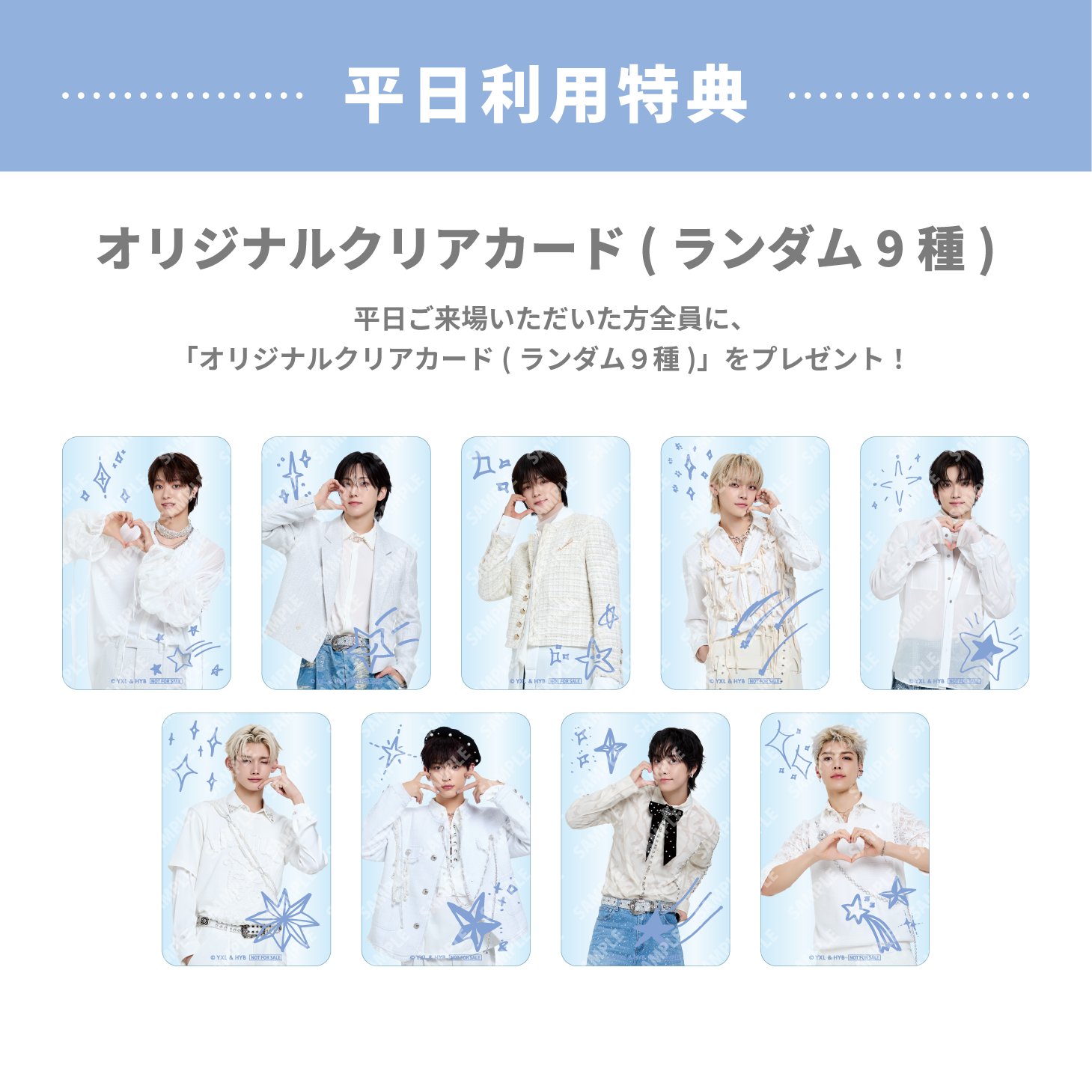 ■平日利用特典:平日に来場いただいた方に「オリジナルクリアカード(全9種)」をランダムで1枚プレゼント。