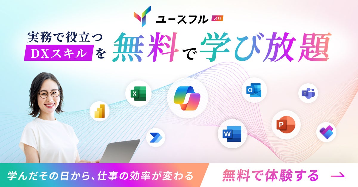 今回リリースした「MOS上級講座」は、定額制学習サービス「ユースフルプロ学び放題」にて受講いただけます。本サービスでは、MOS一般講座やExcel、PowerPoint、Copilotなど、実務に必要な全24講座が学び放題となります。現在、本サービスを1週間無料で体験できるキャンペーンを実施中です。詳細は下記リンクよりご覧ください。