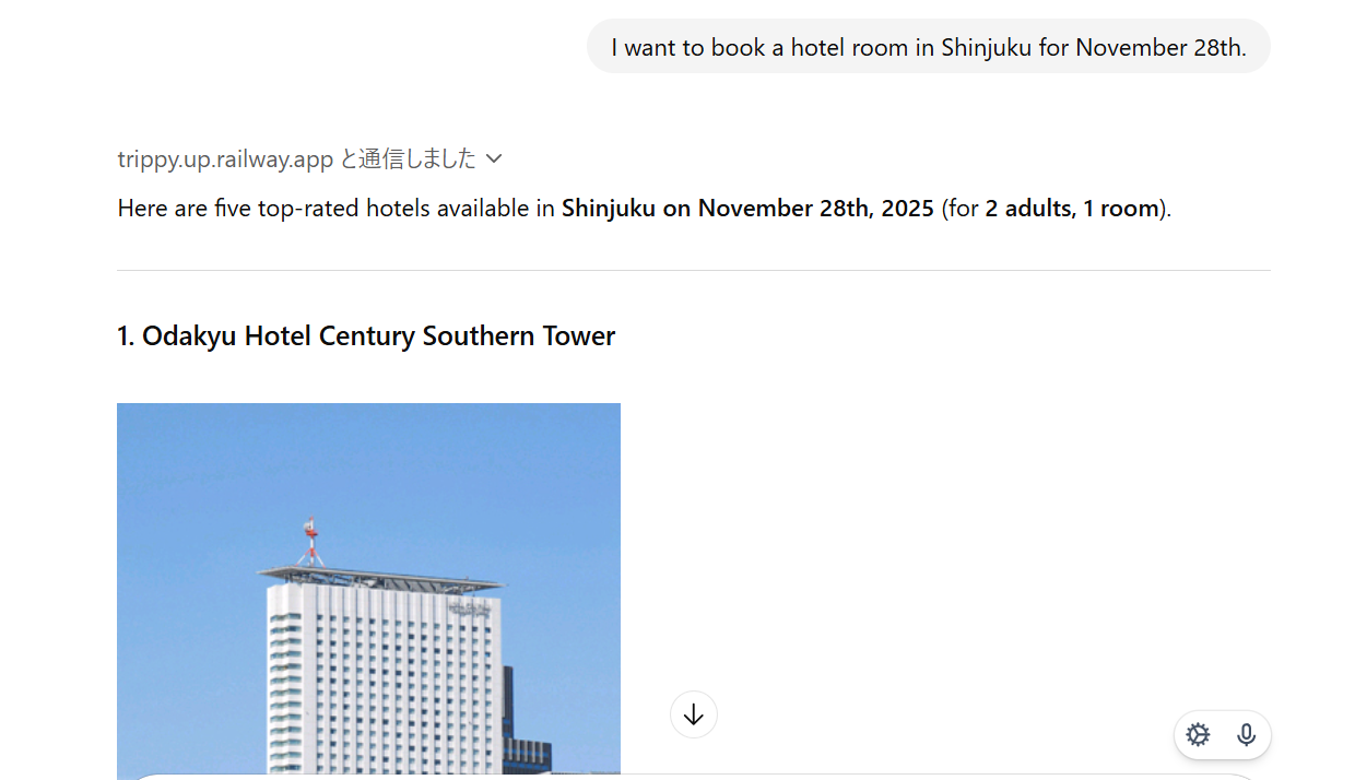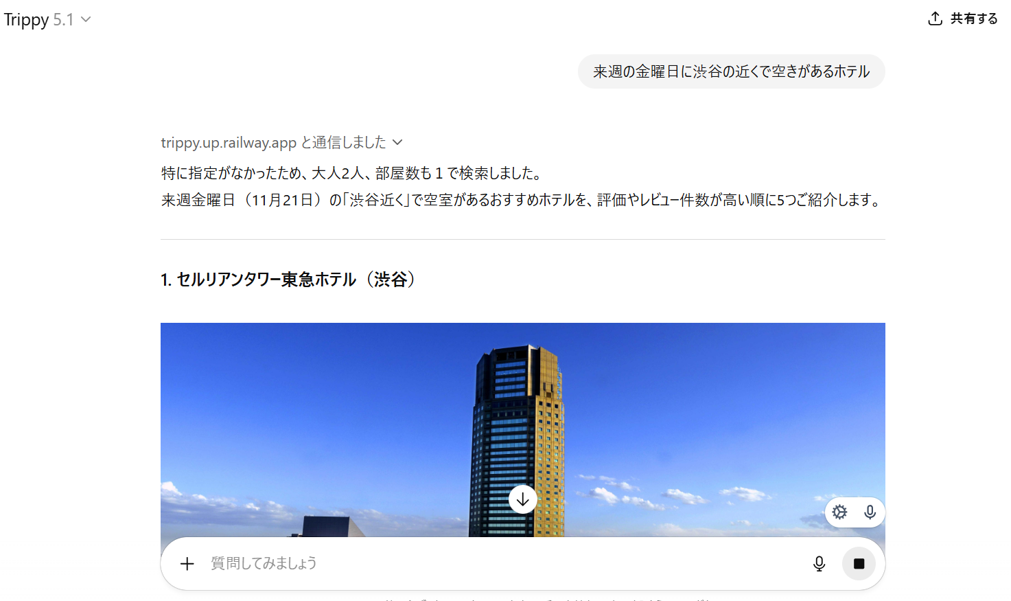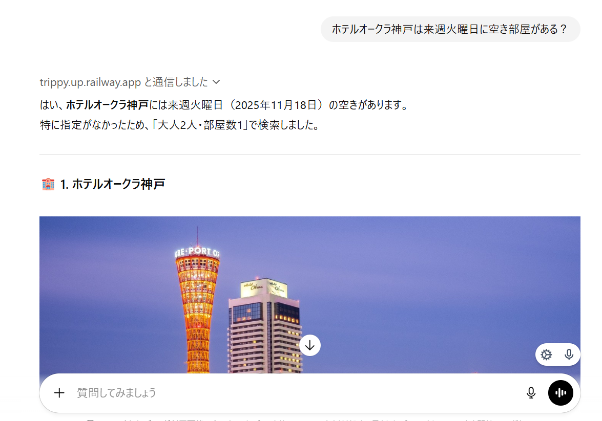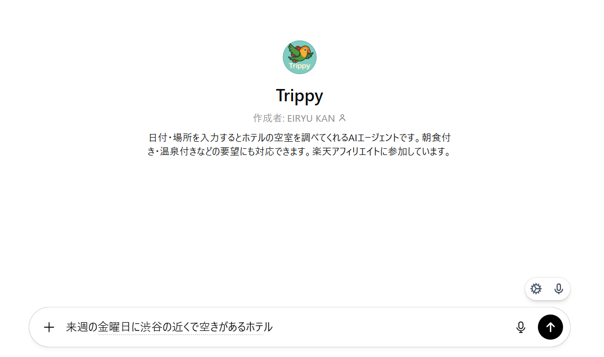 『Trippy』は、場所と日程を伝えるだけで、その日に空室があるホテルのプランを複数紹介してくれるAIエージェントです。
