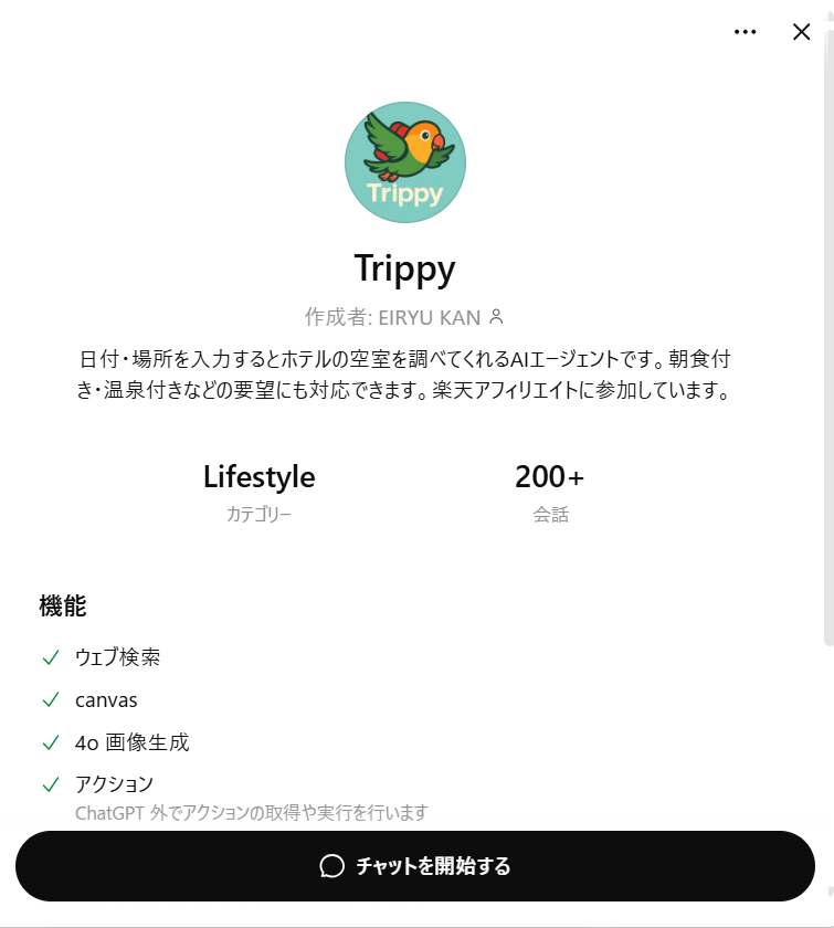 追加するにはこちらのリンクをクリック、またはChatGPT公式のGPTストアから「Trippy」と検索してください。