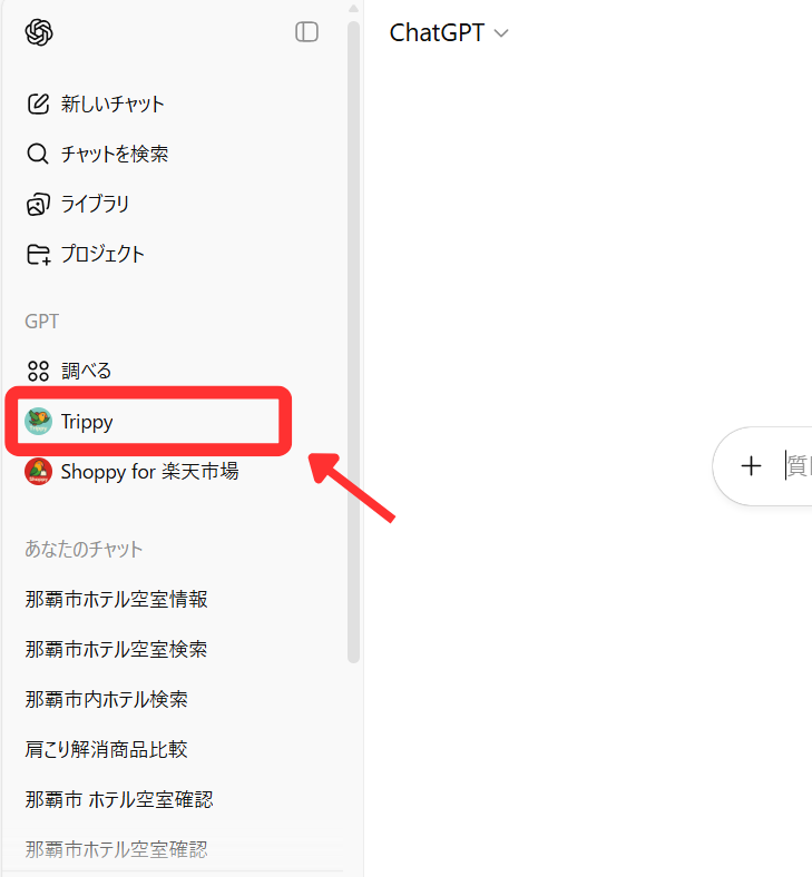 なお、こちらのTrippyはChatGPT上で動くため、外部アプリのインストールや外部サイトにアクセスする必要はなく、ご自身のChatGPTに追加するだけで、ChatGPTのサイドバーからいつでも呼び出すことができます。