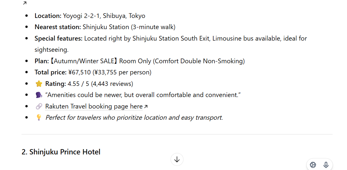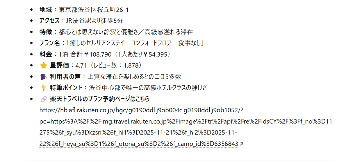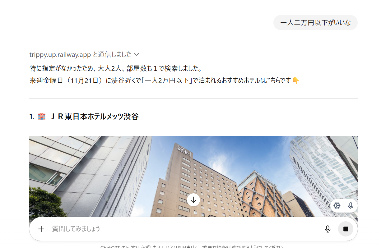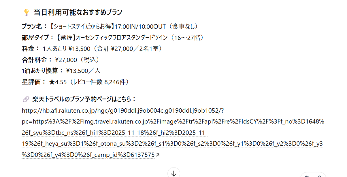 通常のChatGPTと同じく、会話文のなかに必要な情報を入れるだけでAIが意図を汲み取ってくれるため、ユーザーは友達と会話をするような感覚でホテルを探せます。
