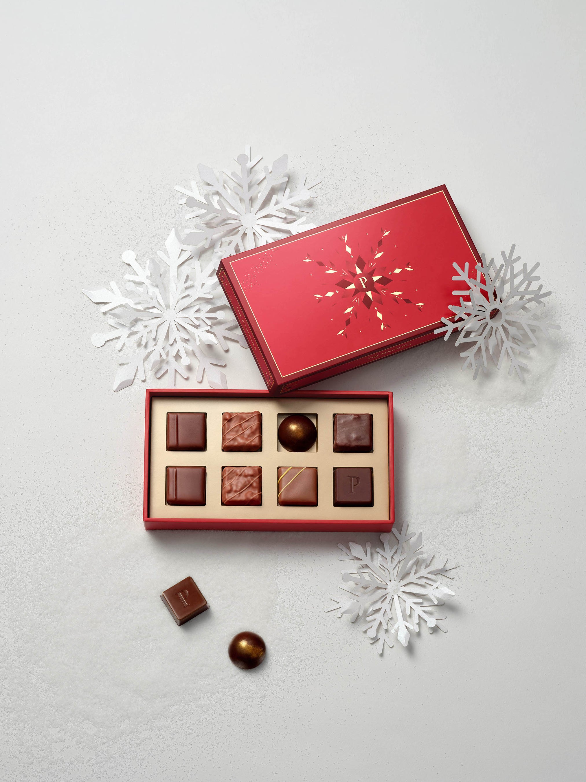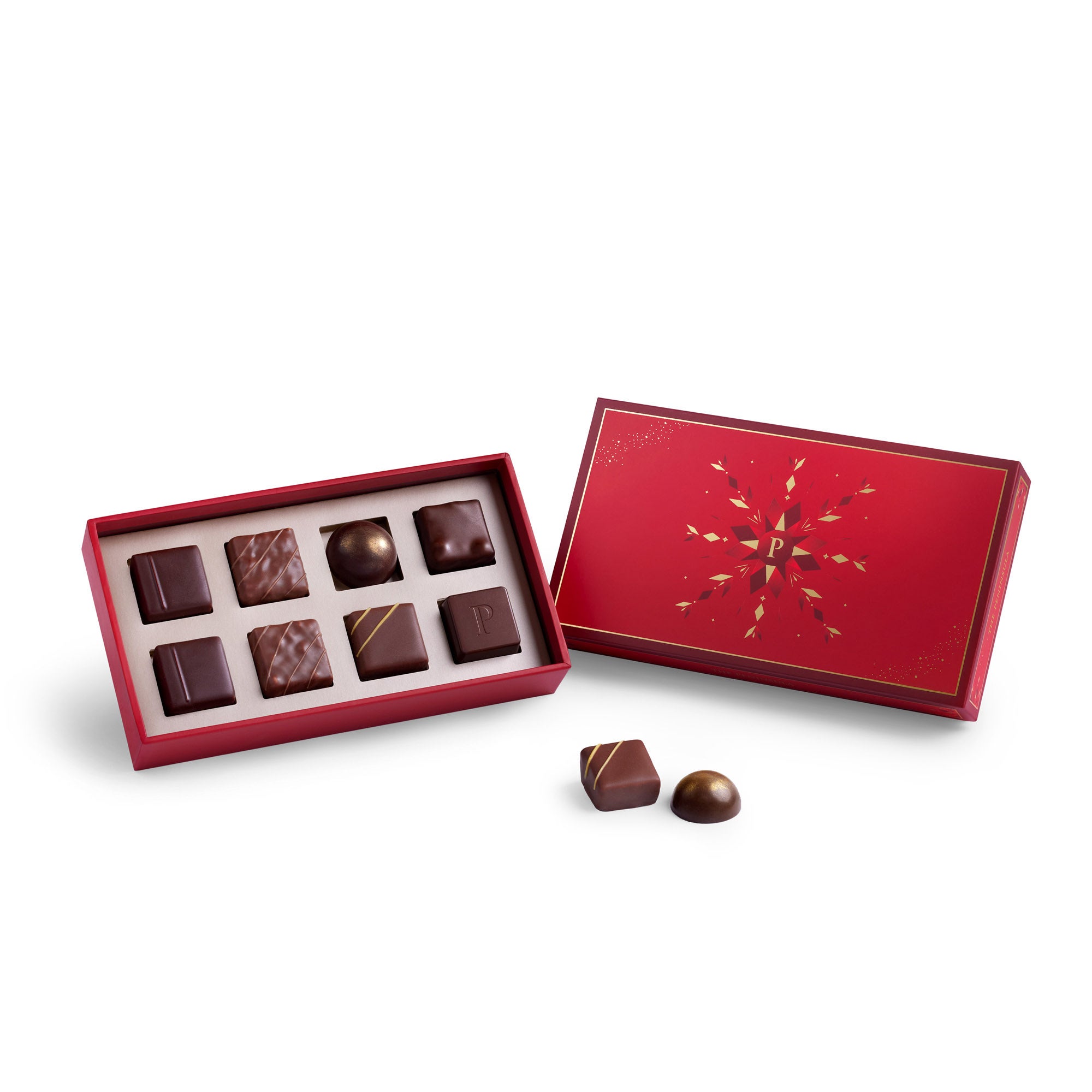 フェスティブ チョコレートセレクション8個入りフェスティブの華やかさと豊かな風味をまとった、8粒のチョコレートボンボン。ひと口ごとにきらめくような美味しさが広がり、ホリデーシーズンの魔法をそっと呼び覚まします。