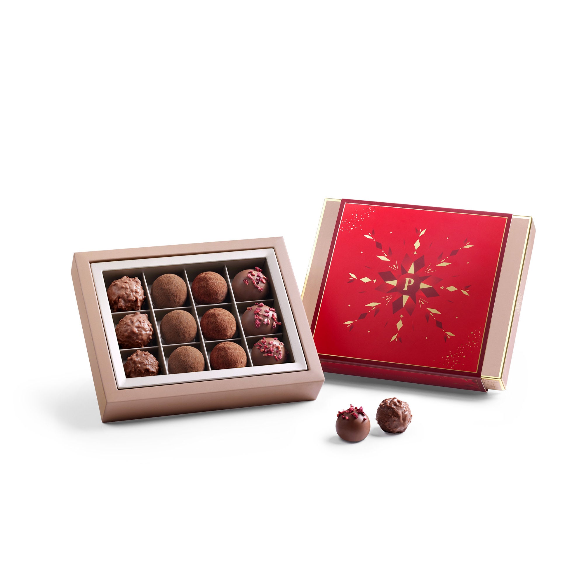 フェスティブ チョコレートトリュフセレクション12粒の手作りトリュフが並ぶ、贅沢なセレクション。英国で最も歴史ある名門ショコラティエのひとつであり、ロイヤルワラント(英国王室御用達)を授与されたショコラティエが、ひと粒ずつ丁寧に作ったチョコレートです。キャラメリゼビスケット、塩キャラメル、ミルクチョコレート、ラズベリートリュフ──多彩な味わいが揃う特別なアソートは、心を込めて贈りたいホリデーギフトにふさわしい一品です。