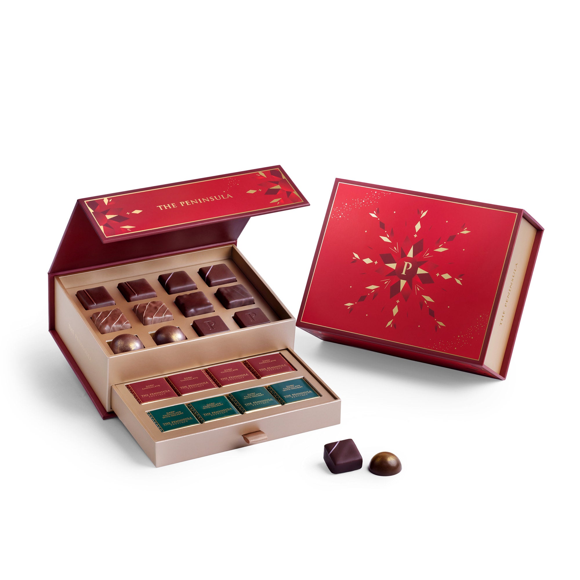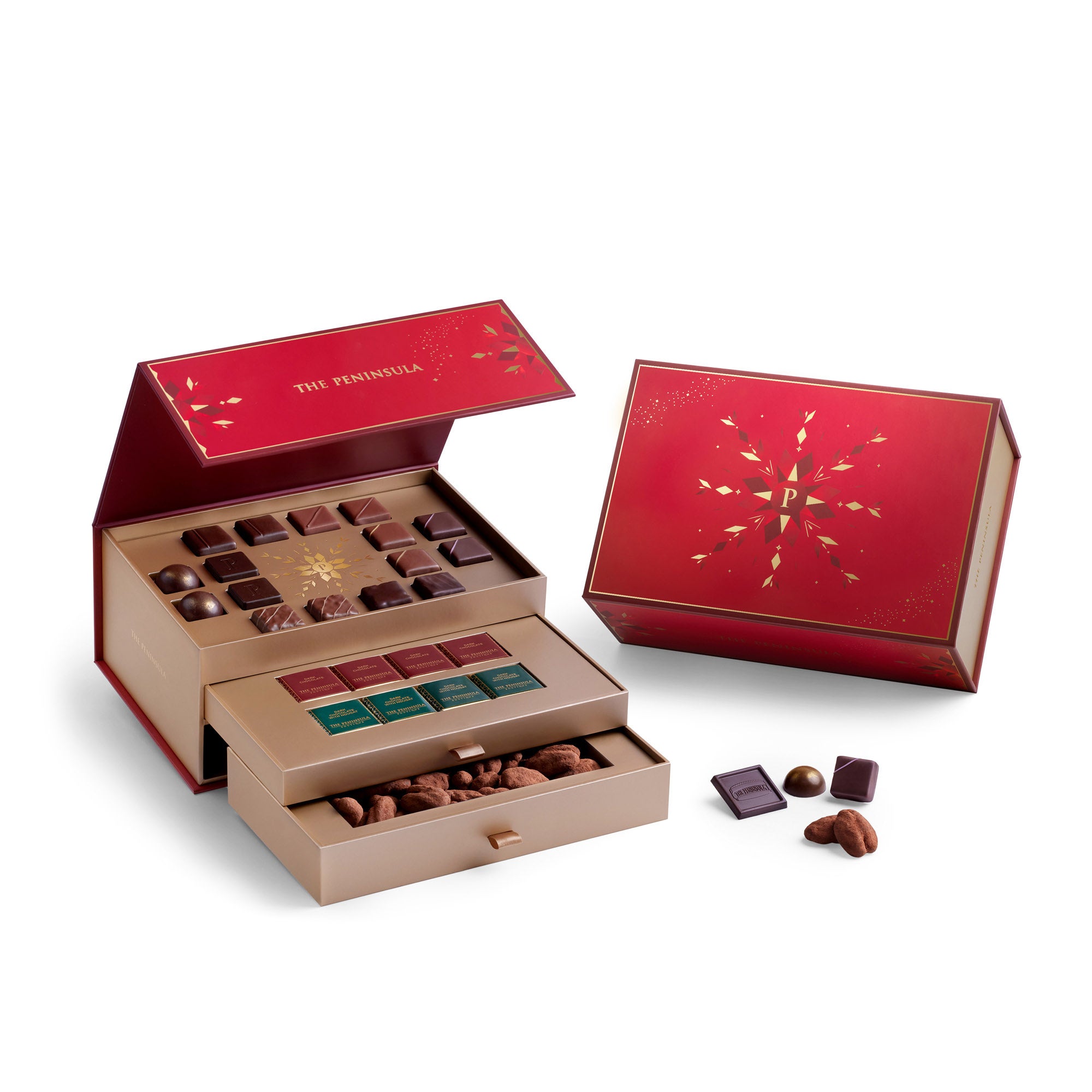 フェスティブ チョコレートディライト鮮やかな赤のギフトボックスに収められた、華やかで豪華な24粒のチョコレートとココアがけピーカンナッツチョコレートの詰め合わせ。フェスティブシーズンならではの味わいと遊び心が詰め込まれ、チョコレートを愛するすべての方を魅了する逸品です。濃厚なカカオ、スパイスの香るフレーバー、カリッとしたプラリネ、誘惑的なヌガー。そのひと粒ひと粒が、クリスマスの喜びそのものを体現しています。