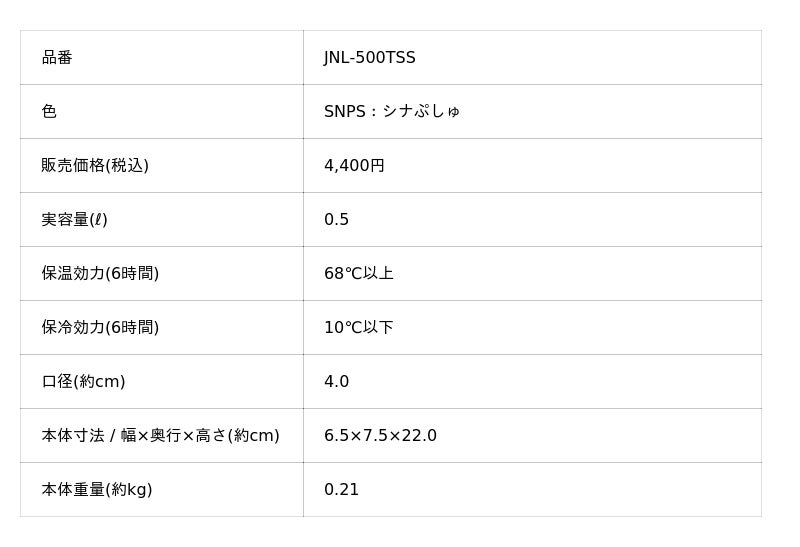 『真空断熱ケータイマグ シナぷしゅ(JNL-500TSS)』 仕様一覧