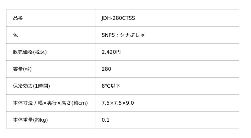 『真空断熱カップ シナぷしゅ(JDH-280CTSS)』 仕様一覧