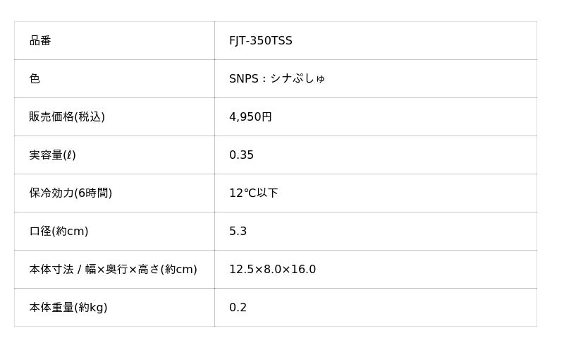 『まほうびんのベビーストローマグ シナぷしゅ(FJT-350TSS)』 仕様一覧