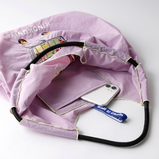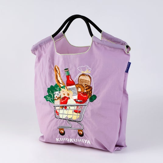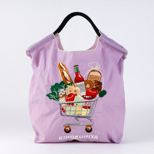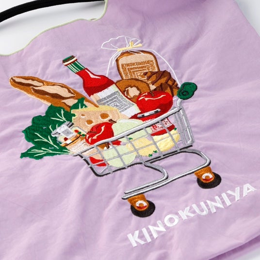 パープルにはカートに乗った彩り豊かな食材が、遊び心いっぱいに描かれ、ベージュには紀ノ国屋のロゴが繊細に刺繍されています。さまざまなスタイリングに自然と馴染みながら、自分らしさをしっかりと主張できる、主役級のアイテムです。気分を高めたい日や、ちょっとしたお出かけにもぴったりなデザインです。