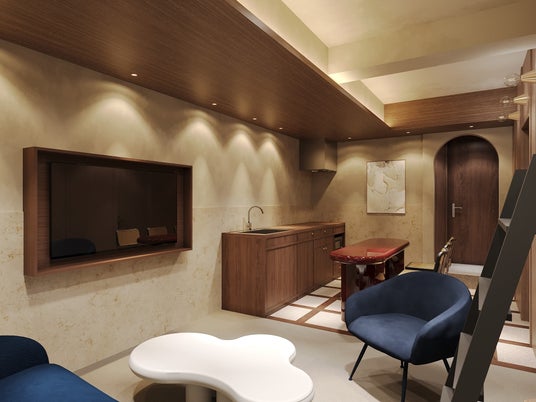 「白で魅せる」をテーマに、表情豊かなアートや壁面、イタリアゴシックを思わせるアーチ天井や石目素材が重なり合い、洗練された空間を創り出します。静寂の中で存在感を放つ真紅のダイニングテーブルと、遊び心あふれる青のソファが非日常の高揚感を添え、大切な方とのひとときを豊かに彩ります。